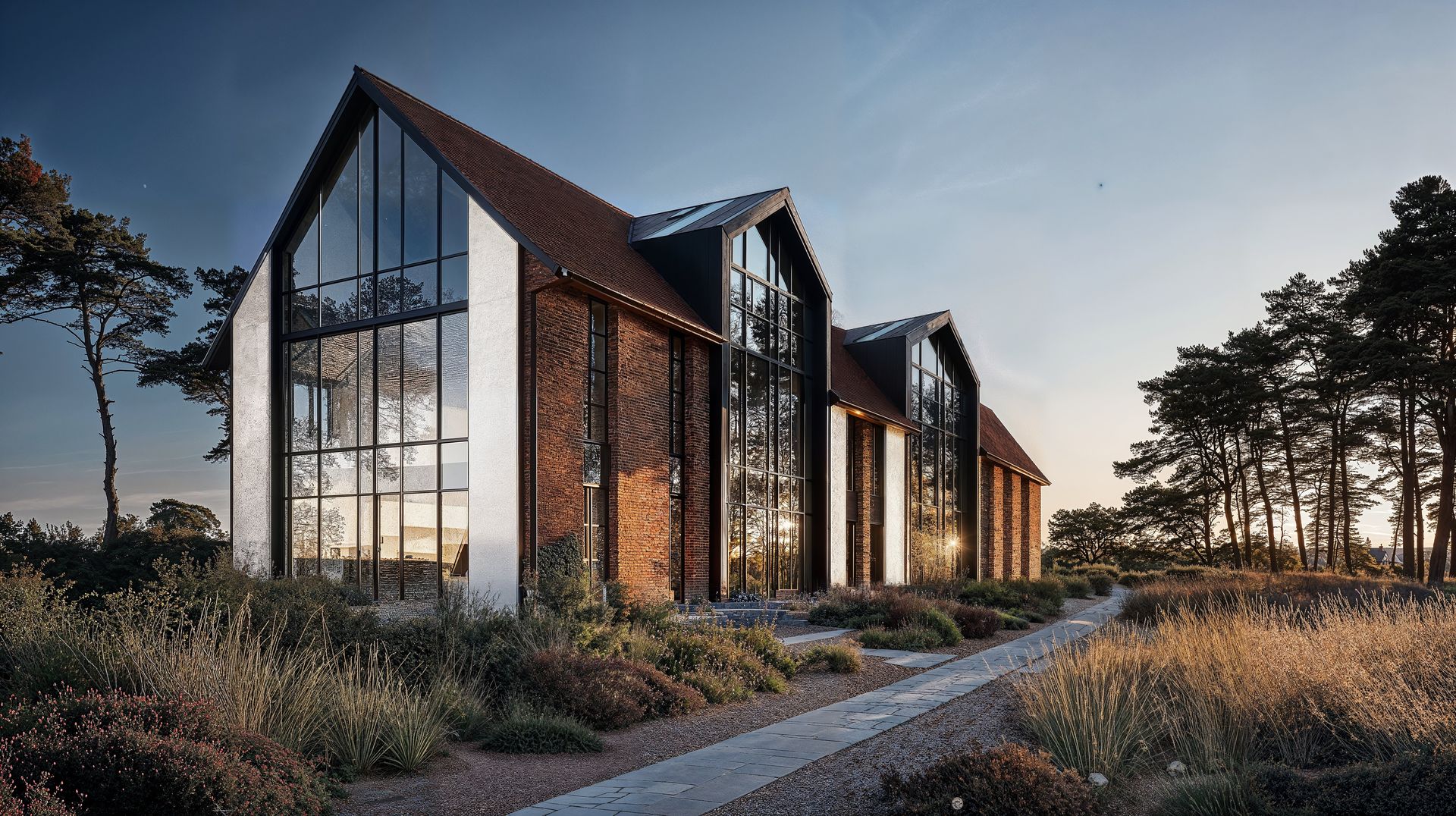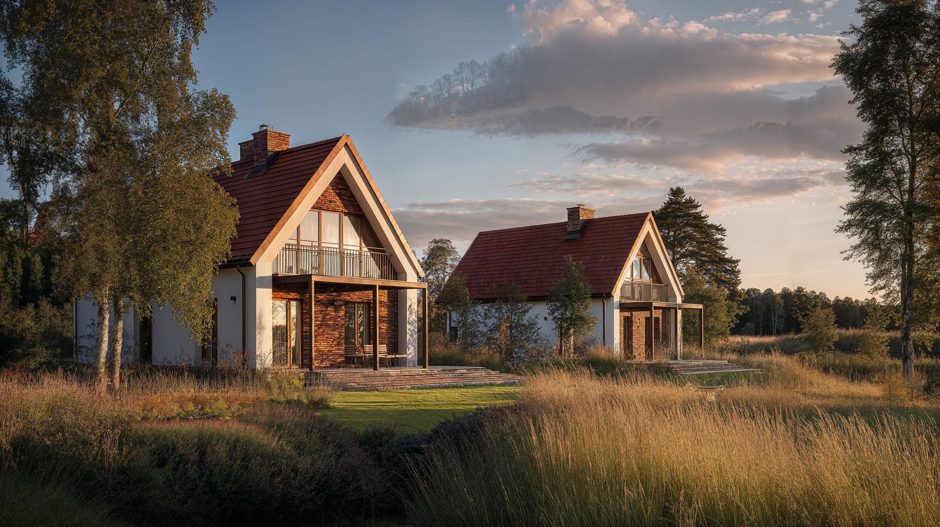 Podział zabudowy na dwa niezależne, ale architektonicznie spójne obiekty (np. 1 – Rezydencja Właściciela; 2 – Budynek Usługowy/Gościnny).